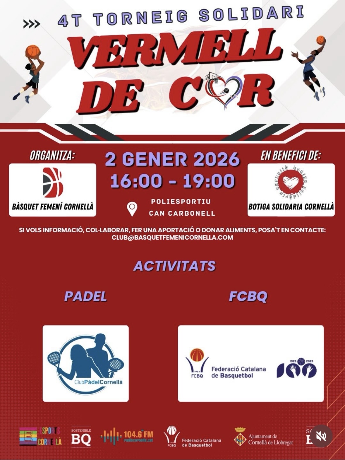 Torneig solidari que organitza el Bàsquet Femení Cornellà por Club Pàdel Cornellà | Ene 2, 2026 | Torneig Participació del nostre club en el torneig solidari que organitza el Bàsquet Femení Cornellà amb l’objectiu principal de recaptar diners per la Botiga Solidària de Cornellà i recollida d’aliments. Informació GaletesPolítica de privacitatAvís legal SeguirSeguir Contacte clubpadelcornella@gmail.com 639254377 Powered by Sportmadness